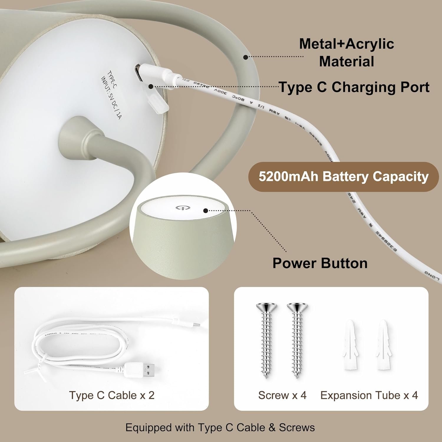 Pamirškite sudėtingus elektros instaliacijos darbus – šis sieninis šviestuvas veikia be laidų ir turi integruotą 5200 mAh talpos įkraunamą bateriją. Komplekte rasite Type-C įkrovimo laidą, kuriuo greitai ir patogiai įkrausite šviesos šaltinį. Montavimas labai paprastas – užtenka pritvirtinti šviestuvą varžtais arba kabliuku prie pasirinktos sienos, o prireikus jį lengvai nuimsite.