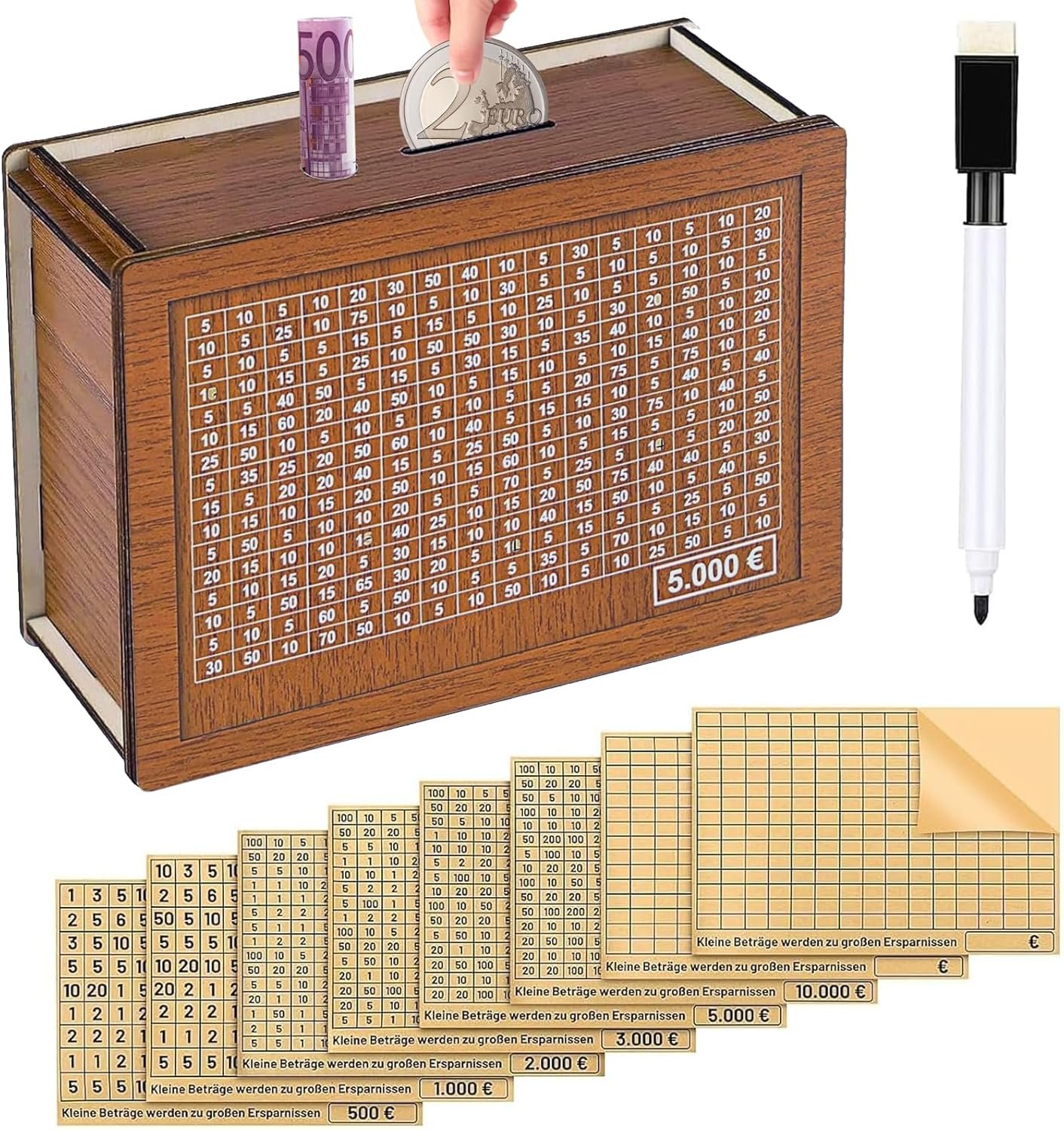 Rinkinyje rasite: 1 itin tvirtą medinę taupyklę, 1 daugkartinio naudojimo vandeniu ištirpinamą žymeklį bei net 8 įvairių skaičių lipdukus, kurie leis nustatyti taupymo etapus ir nuolat stebėti savo progresą. Lipdukai simbolizuoja skirtingas sumas, todėl taupymas tampa ne tik paprastas, bet ir įtraukiantis, suteikiantis motyvacijos siekti vis daugiau.